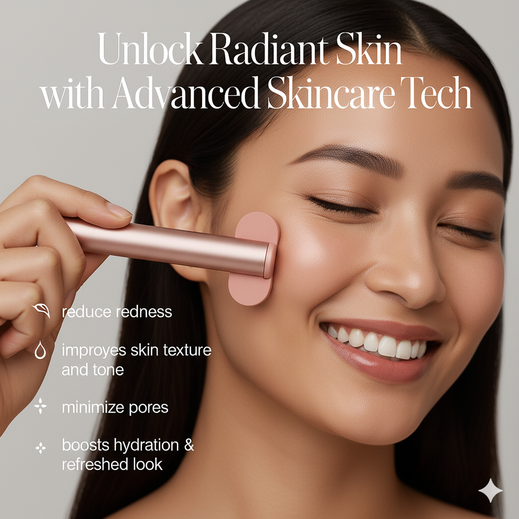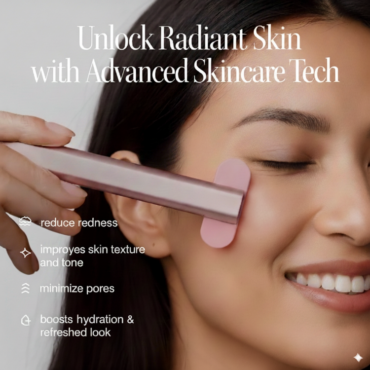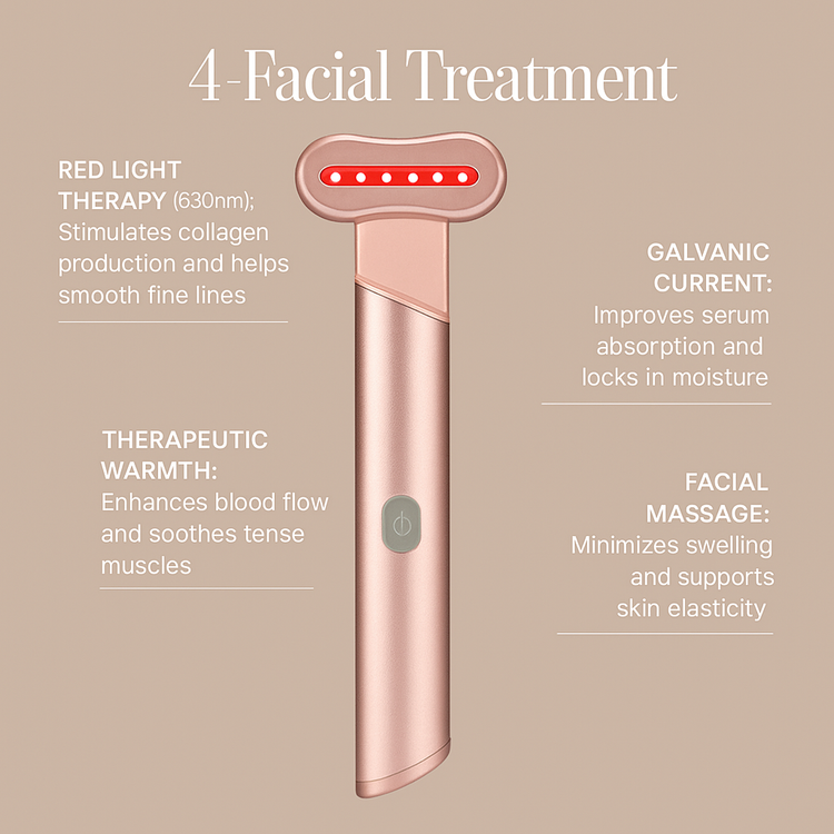 • Red light therapy for collagen • Galvanic current for hydration • Vibrational massage for lift • Gentle warmth soothes skin